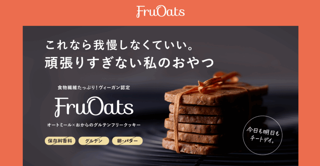 「FruOats(フルオーツ/ヴィーガン&グルテンフリークッキー【フルオーツ】)」は、スーパーフードが詰まったグルテンフリーのヘルシークッキーです。